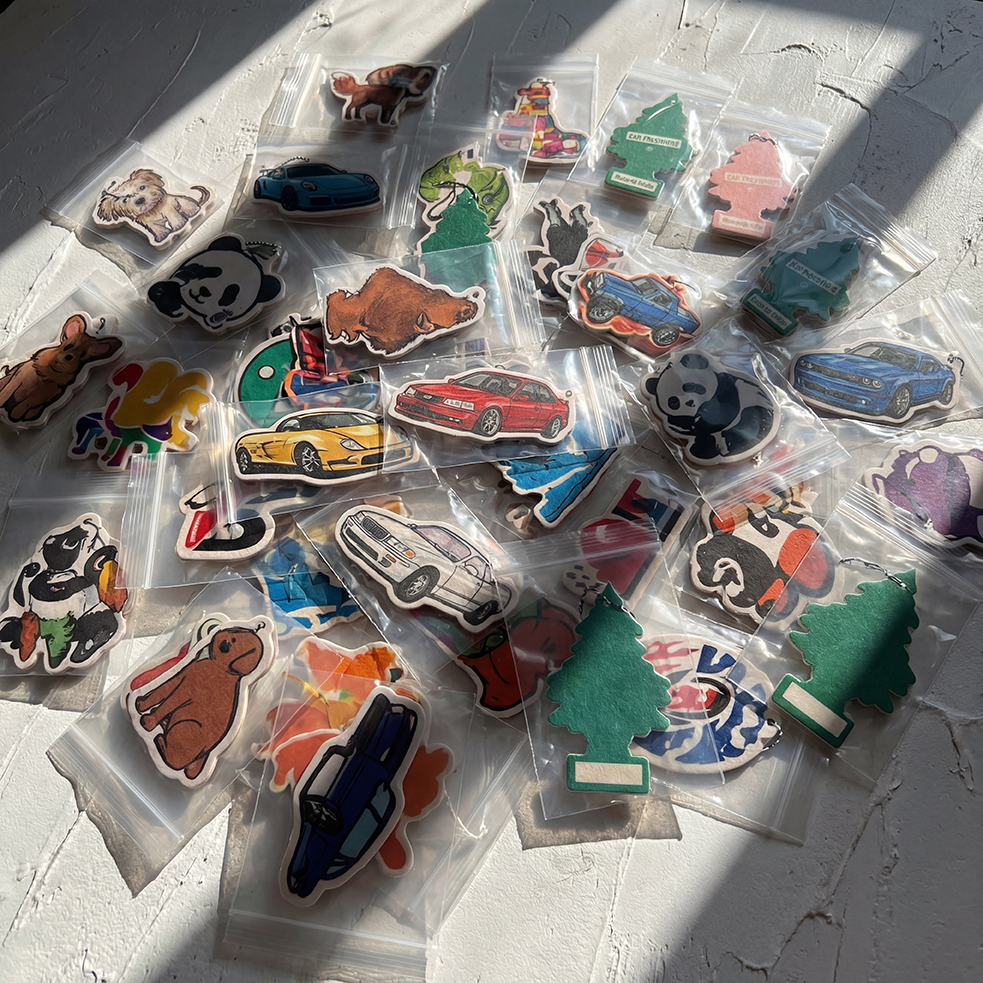 The classic, sleek choice. Your custom air fresheners are sealed in a transparent, airtight foil to preserve the fragrance until they are ready to be used. Perfect for high-volume promotions and events.
